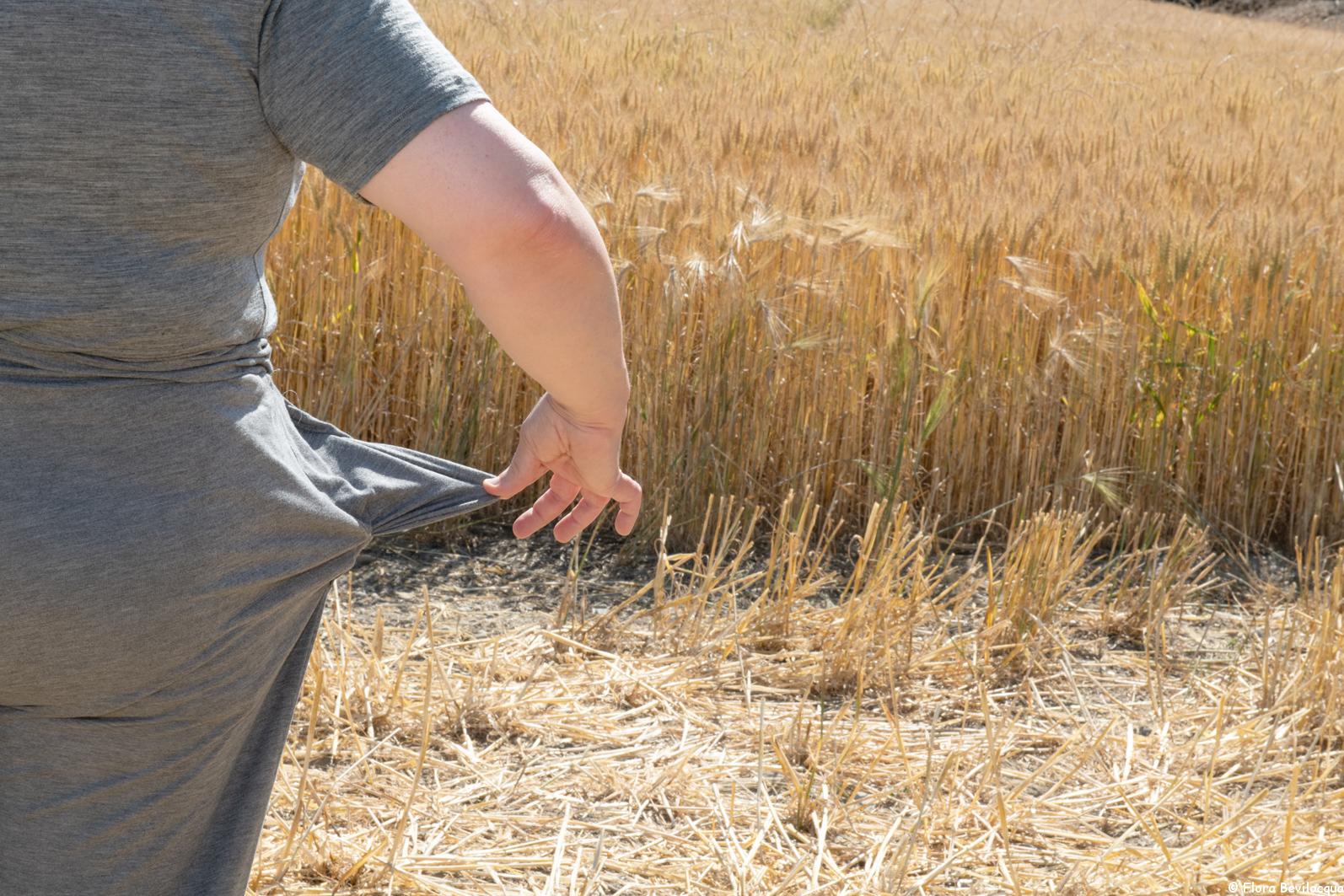 Je voulais trouver un champ qui avait été partiellement moissonné afin de bien montré qu’il s’agissait de blé et qu’une partie du champ avait été fauchée. Il faisait très très chaud ce jour-là … mais le doré des blés ressortaient bien avec ce beau soleil.